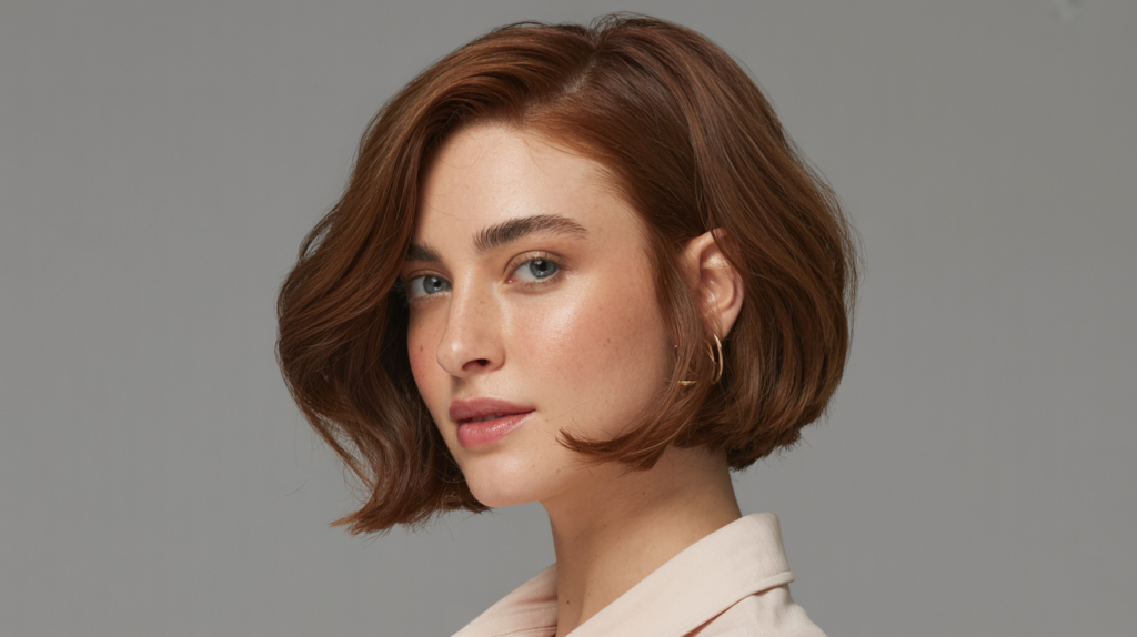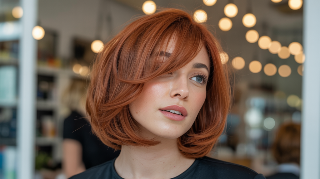 A radiant coppery red layered bob enhanced with soft side bangs that frame the face elegantly. This hairstyle combines warmth, modern layering, and easy styling for a bold yet graceful finish.