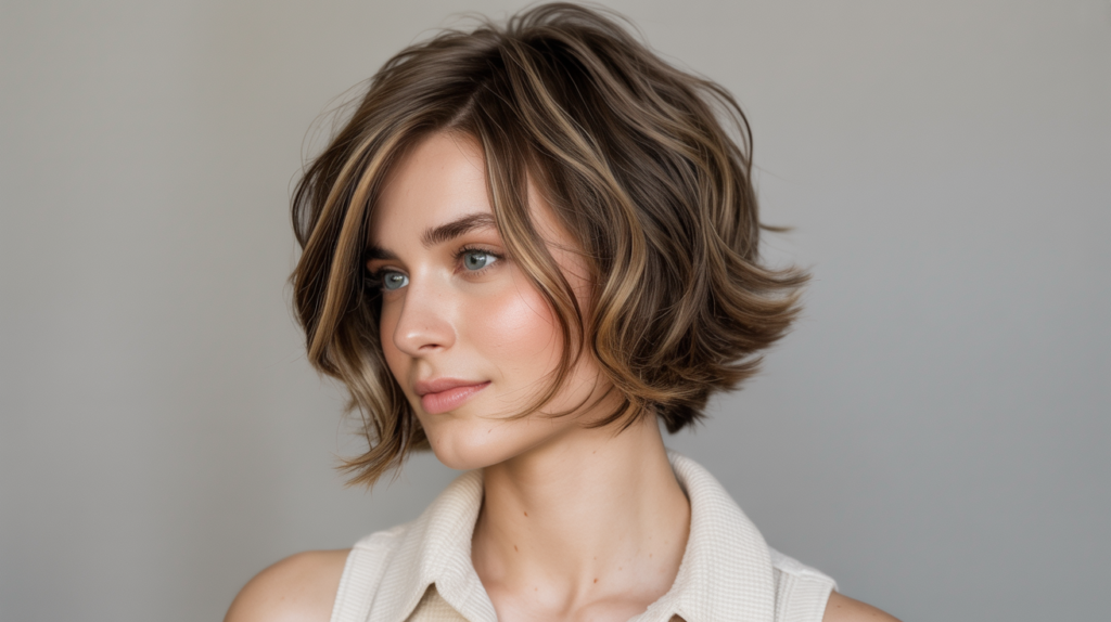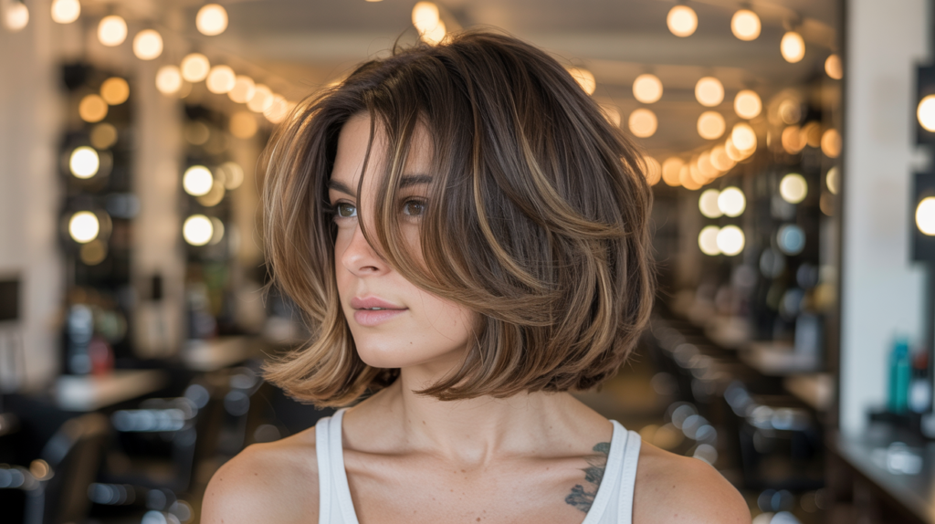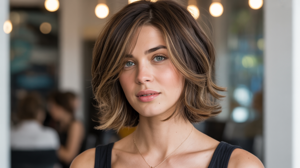 A modern chin-length bob with layered texture and soft caramel highlights, perfect for adding depth and warmth to brunette hair. A polished yet effortless style suited for everyday wear.