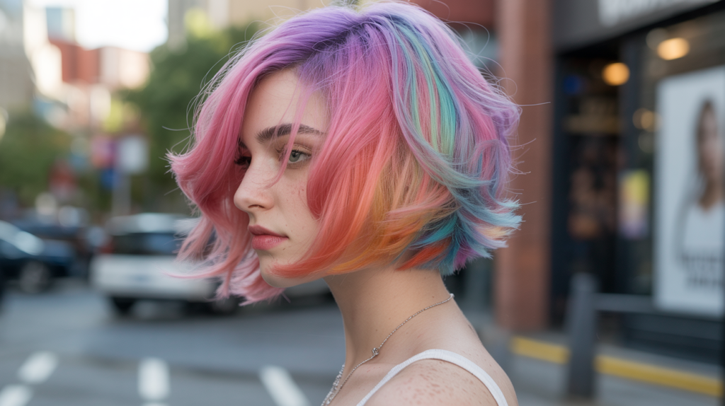 A radiant pastel rainbow layered bob that combines artful color blending with volume and movement. Perfect for bold personalities who want their haircut to reflect creativity and vibrancy.