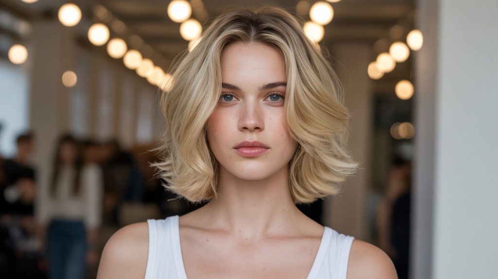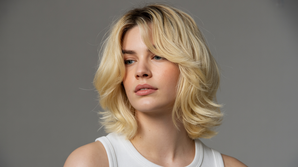 This blonde shoulder-length layered bob adds fullness and natural body, giving hair a youthful bounce and effortless texture that flatters many face shapes.