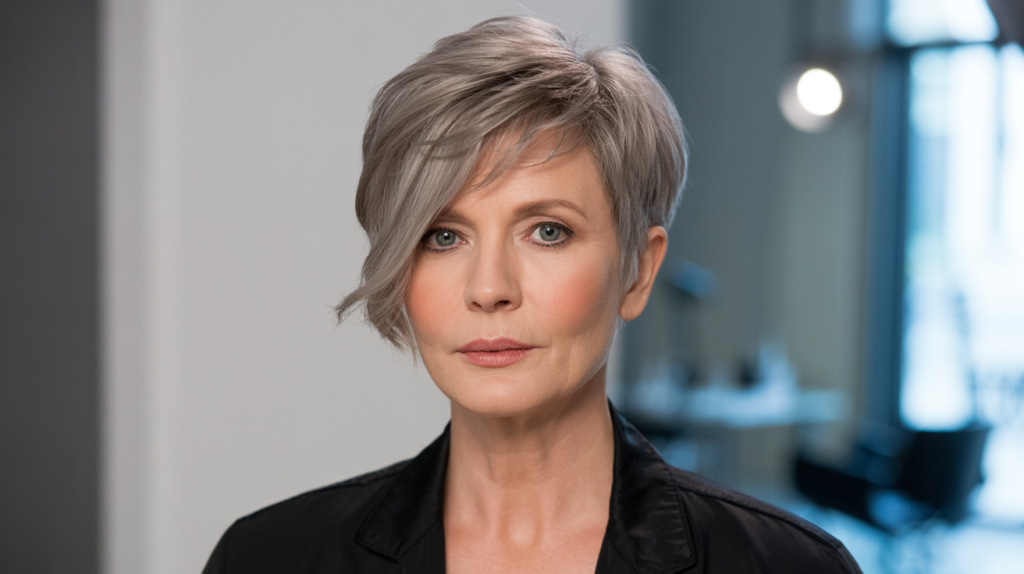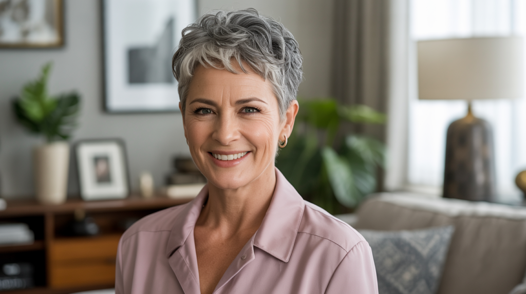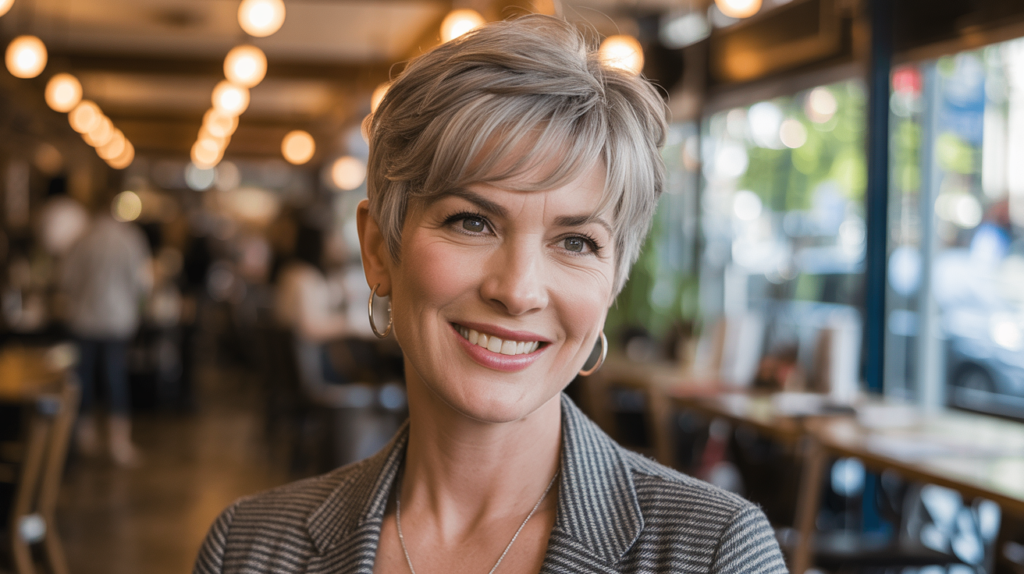 Enhance your natural gray hair with a sleek pixie, a timeless option that radiates confidence and cuteness for mature women.