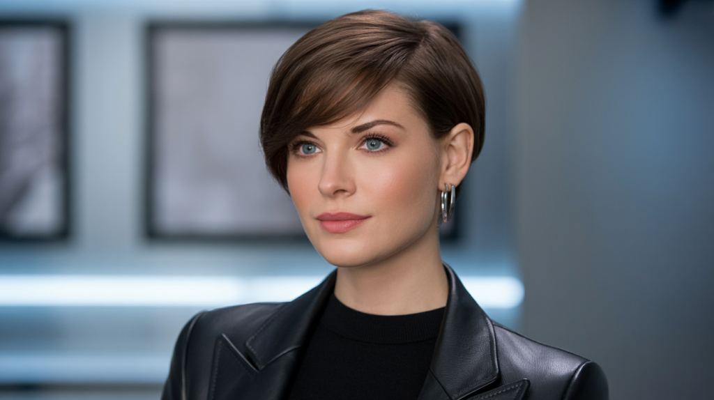 A side-parted short haircut offers sleekness, framing the face beautifully while maintaining an easy-to-style appearance. It goes well for all face shape types.