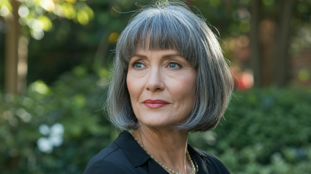 Maintain the natural color of your hair and look good with this gray bob. Paired with fringe, it exudes elegance while keeping things low-maintenance and age-appropriate.