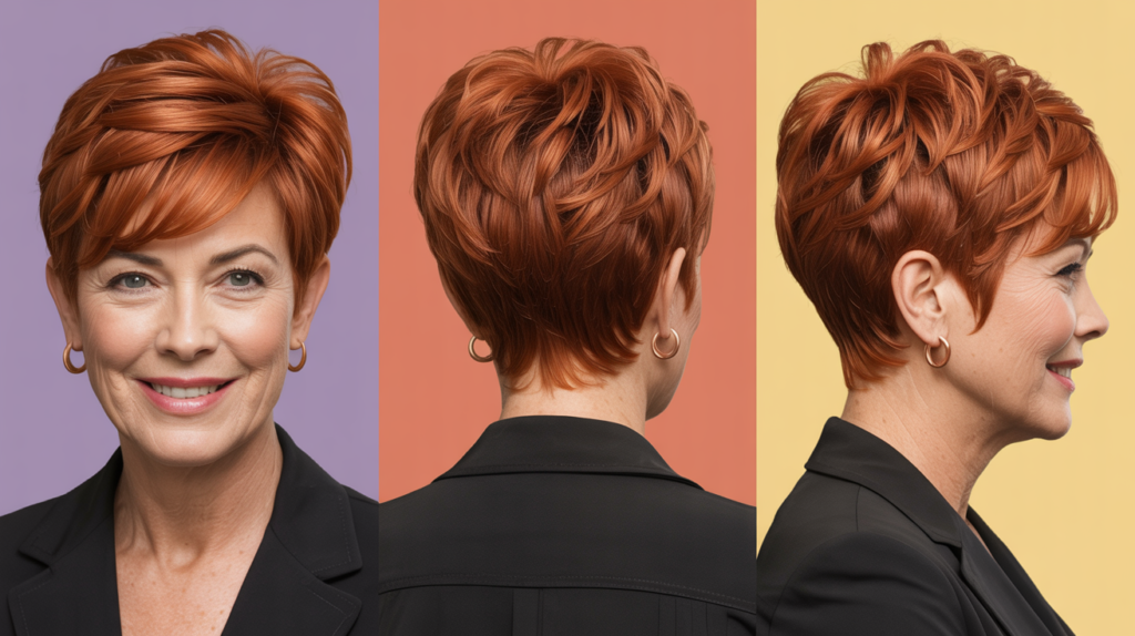 A vibrant Copper Wedge Pixie shown from front, back, and side views. This short layered cut blends pixie texture with wedge volume for a modern, flattering finish.