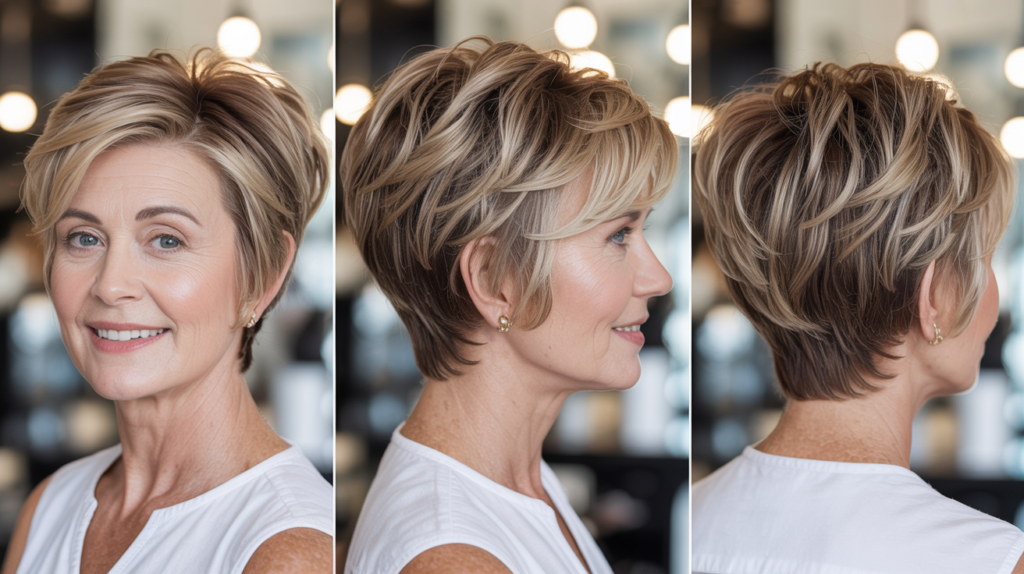 A graceful Highlighted Pixie Bob wedge haircut shown from front, back, and side angles. This look blends texture, volume, and highlights to create a youthful, low-maintenance finish.