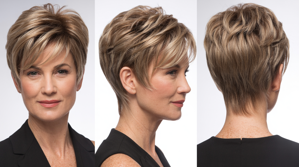 A sleek pixie bob hairstyle shown from front, back, and side angles. This timeless cut delivers elegance, structure, and ease for women over 40.