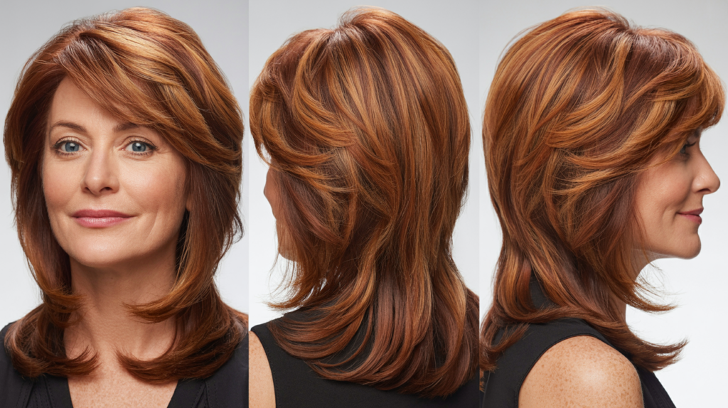 A stylish layered copper brown hairstyle shown from front, back, and side angles. This look brings warmth and depth to hair, making it a perfect choice for women over 40.
