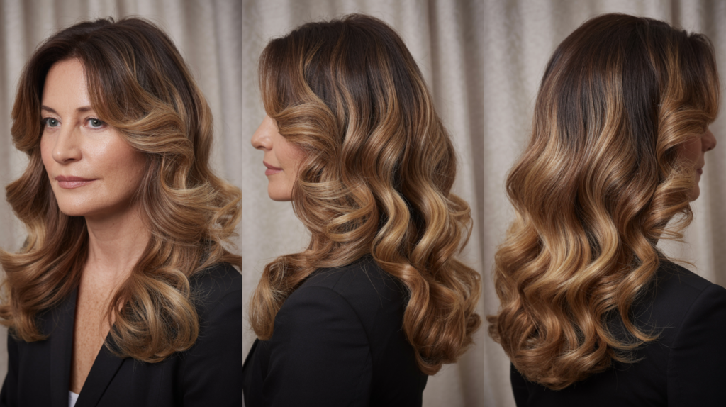 A long wavy hairstyle with dark root melt shown from the front, back, and side. The soft waves and root contrast create a flattering and elegant look for women over 40.