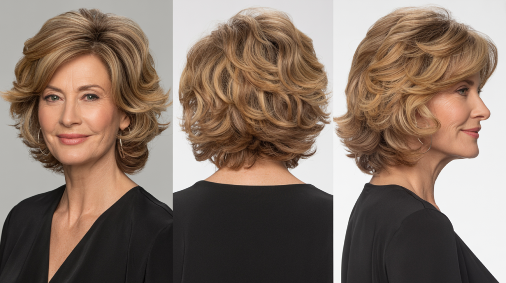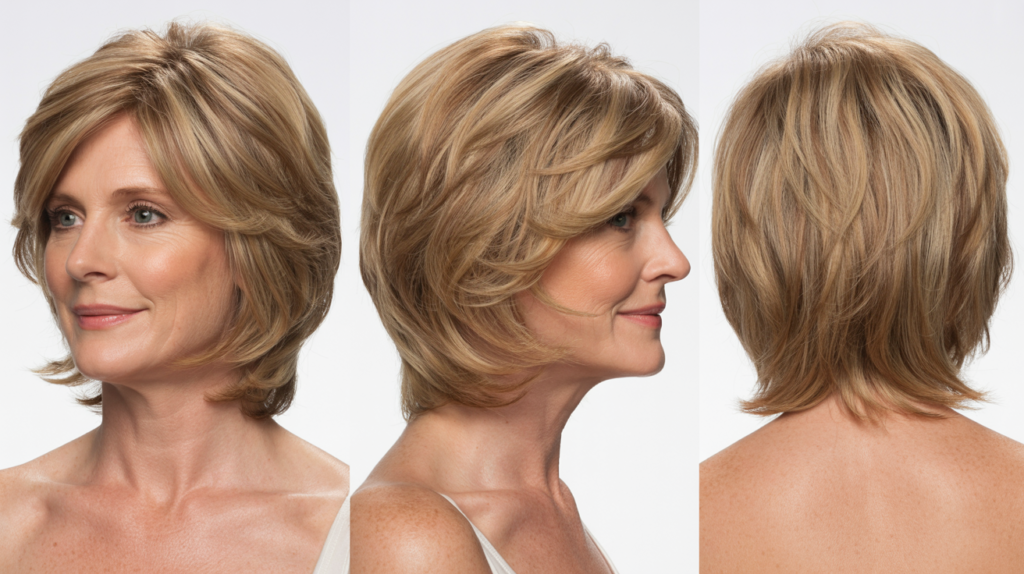 A stylish voluminous layered blowout shown from front, back, and side angles. This cut offers body, movement, and a modern touch to short hairstyles for women over 40.