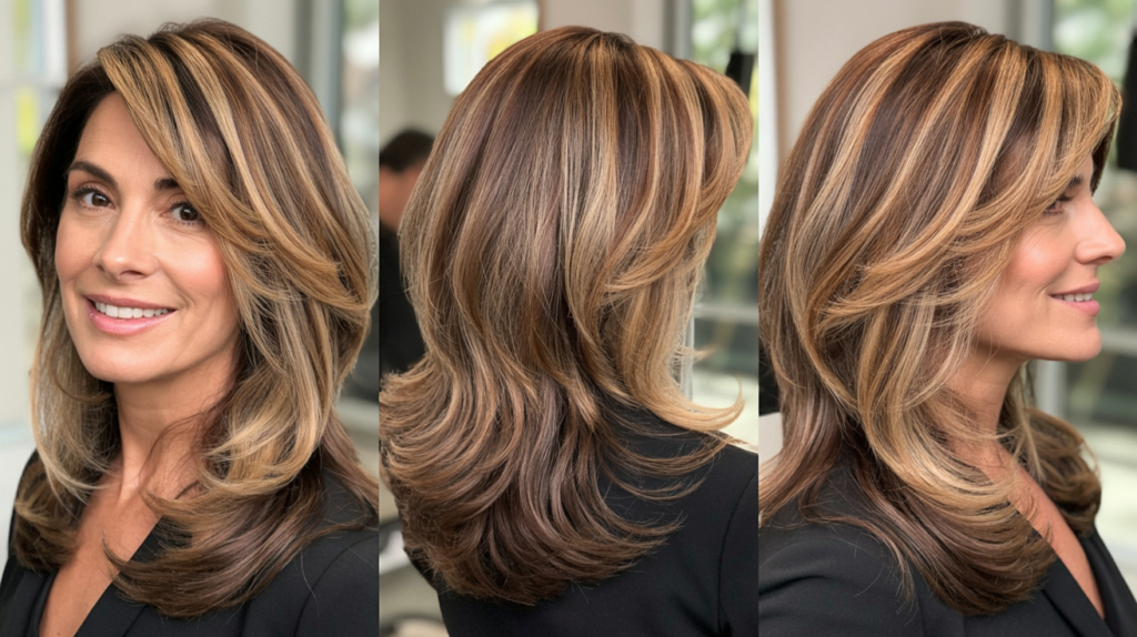 A chic long layered hairstyle with face-framing balayage, displayed from front, back, and side angles. The style combines natural flow and subtle highlights, making it a flattering choice for women over 40.
