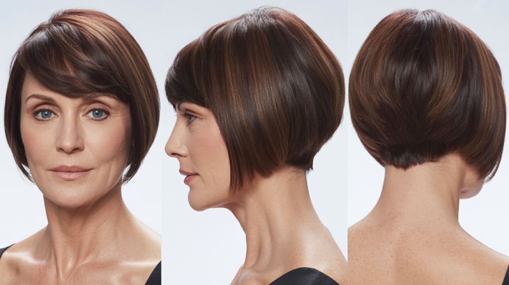 A chic angled bob with bangs shown from front, back, and side views. This hairstyle delivers sharp lines with soft bangs for a youthful yet sophisticated look.