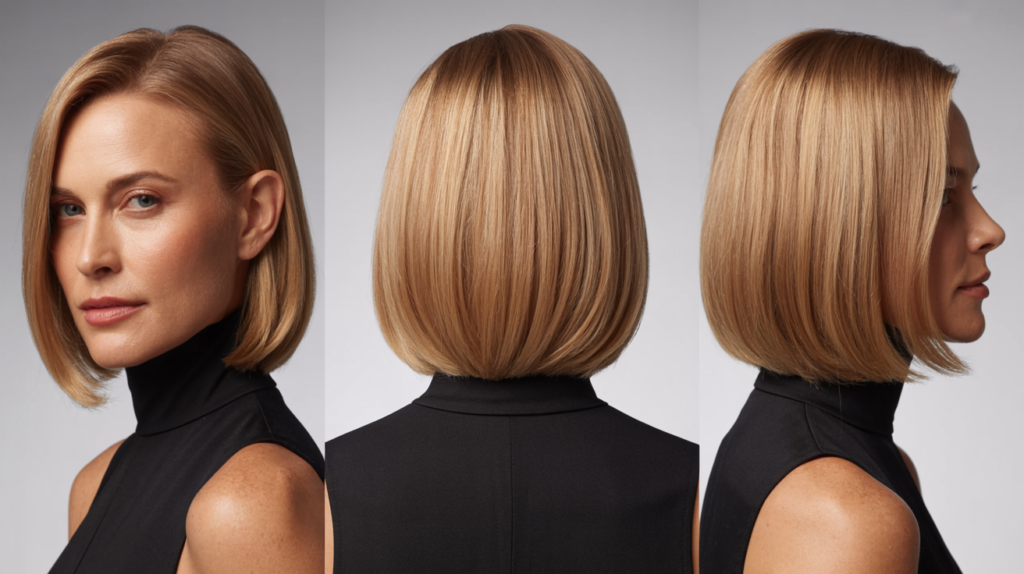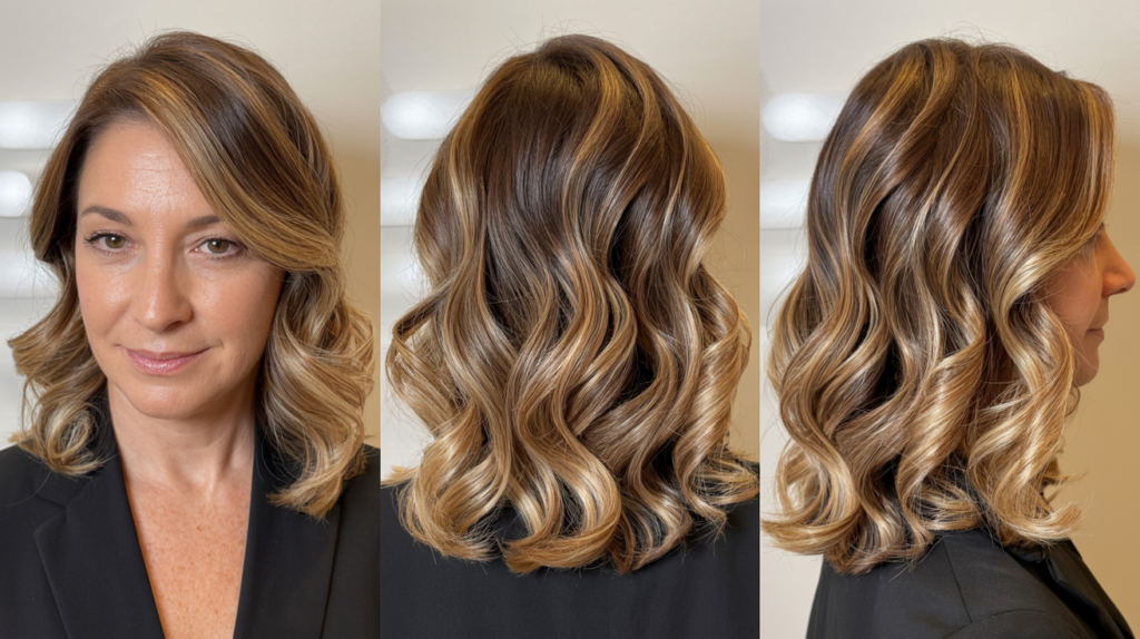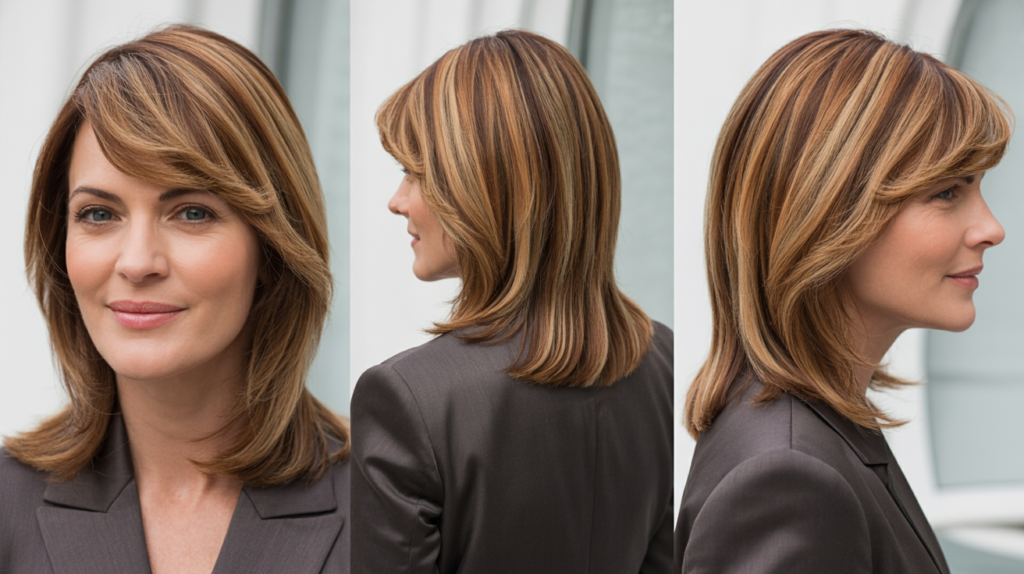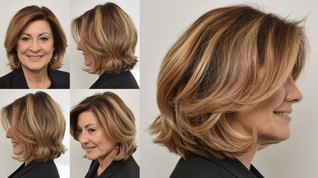 A chic shoulder-length hairstyle with subtle balayage, shown from front, back, and side angles. This look adds movement and dimension while staying modern and flattering for women over 40.