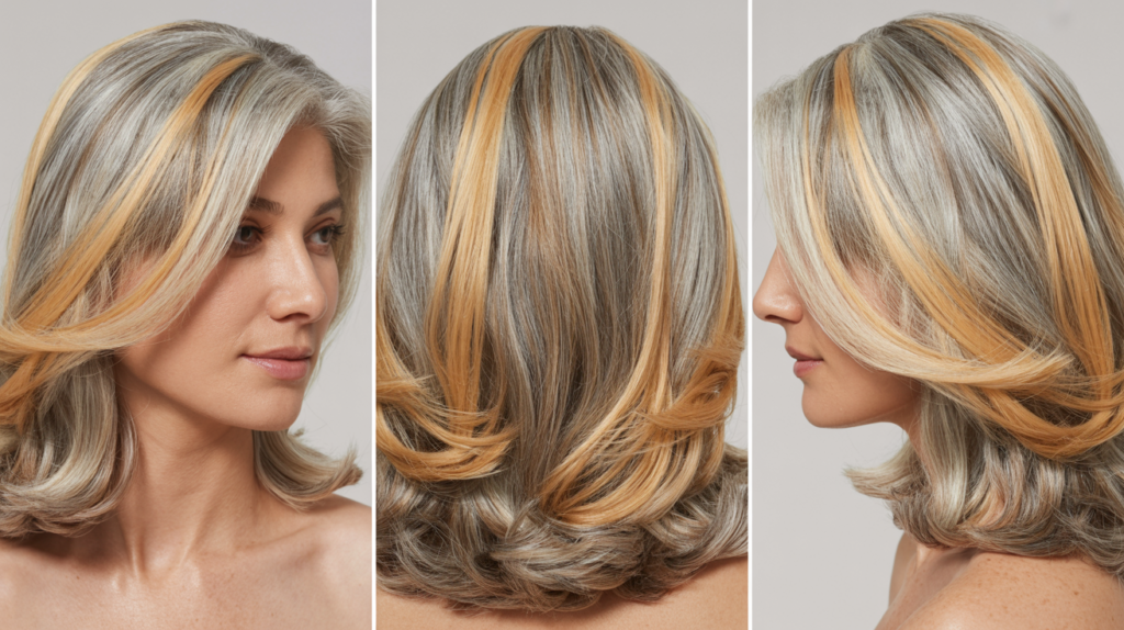 A beautiful hairstyle featuring blonde highlights over gray hair, shown from front, back, and side views. This cut blends natural gray tones with blonde brightness for a soft, elegant style.