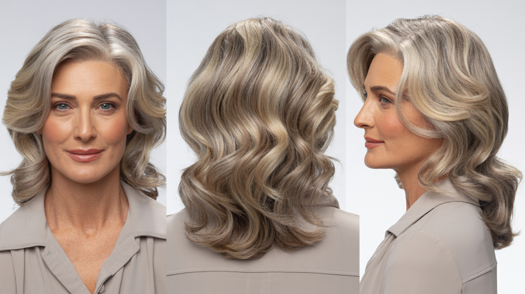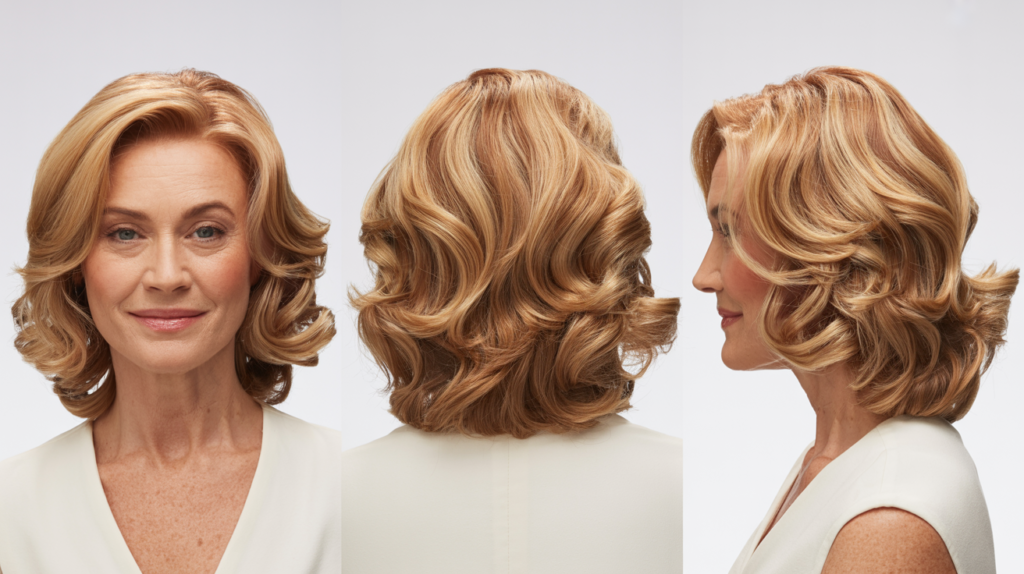 Medium waves with a side part shown from the front, back, and side. A flattering style that balances volume, texture, and elegance for women over 40.
