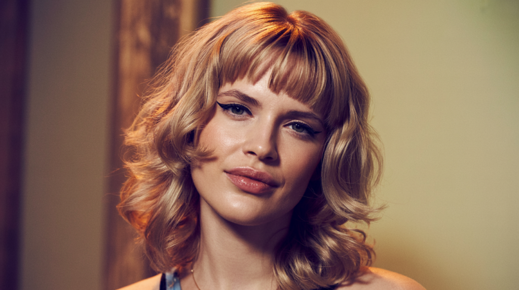 Adding bangs to your blonde waves to create a dynamic and youthful vibe. The messy nature of the haircut makes it ideal for informal and everyday appearance.