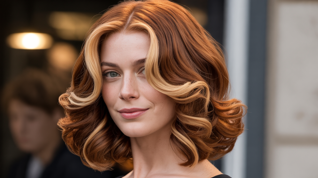 Elevate your style with a touch of playful drama, just like this long auburn bob adorned with waves and a striking money piece.