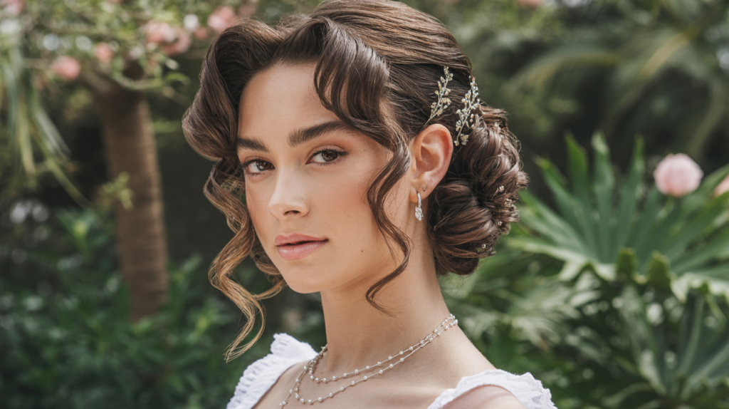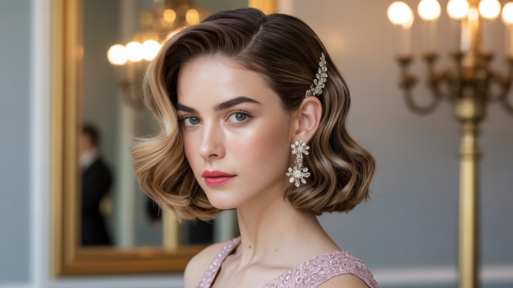 the perfect formal hairstyle for bob-length hair. Soft vintage waves paired with a twisted pullback and a statement accessory create a graceful, polished look.