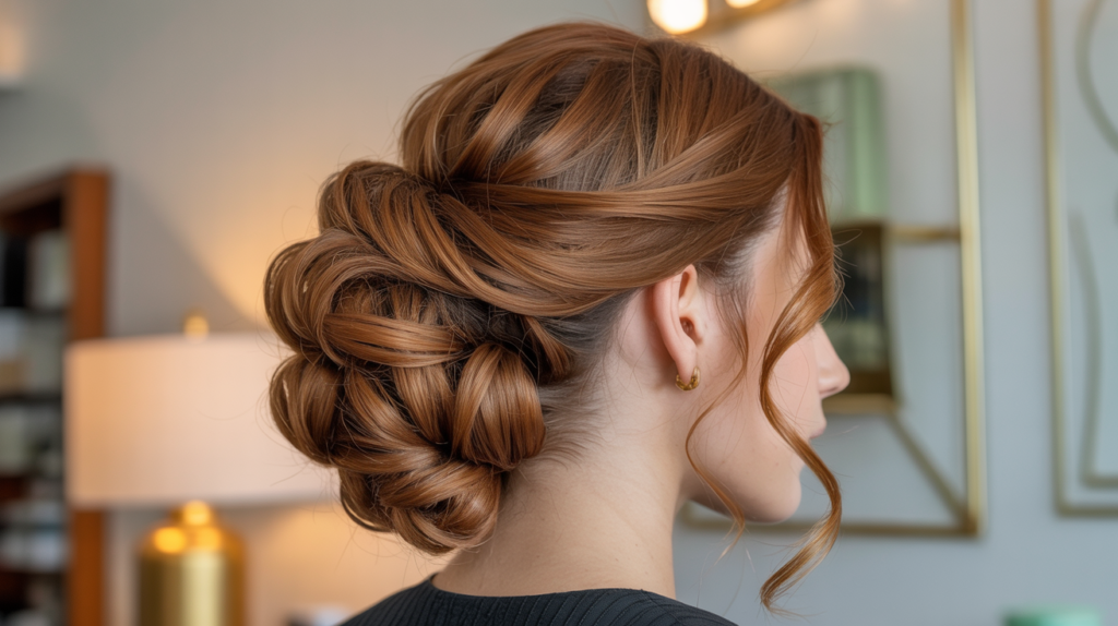 The hair is swept up into a high, twisted arrangement that creates beautiful height, softened by loose curls falling at the nape and temples. It’s especially flattering for highlighting dimension in caramel-toned hair.