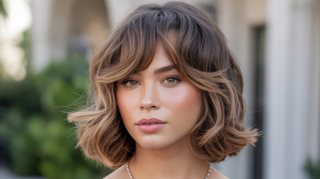 Instead of a stiff updo, this look embraces movement with swooping curtain bangs and bouncy, flicked-out layers that frame the face perfectly. It’s a fresh, trendy choice for prom if you want to look effortlessly glam.