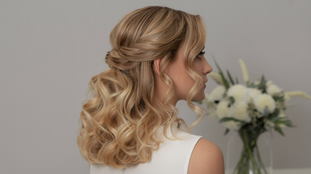 The style features a loosely twisted half-up section that creates soft volume at the crown, flowing into cascading, dimensional blonde curls. It strikes the ideal balance between formal and boho-chic.