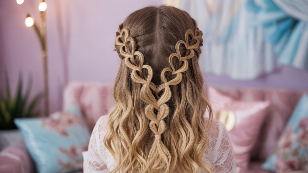 2. Whimsical Heart Braid Half-Up with Cascading Curls