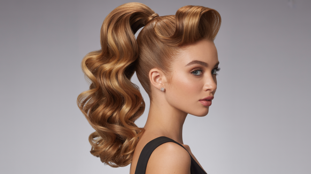 The hair is swept back cleanly to highlight your features, erupting into a high, tumbling pony of large, glossy curls. It’s a stunning choice for girls who want to look polished yet glamorous on their special night.