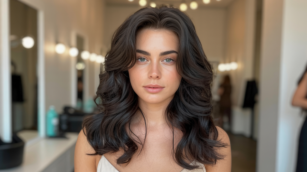 The dark locks are pulled into a voluminous top section, letting long, textured waves cascade down your back, while soft tendrils gently frame the face. This look is amazing for adding length and fullness to thick hair.