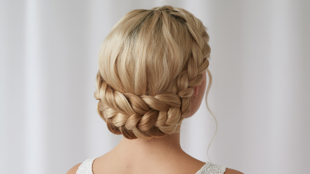 The hair is woven into a thick, wraparound plait at the nape, creating a beautiful halo effect while keeping your neck cool. It’s a stunning choice for prom if you want to showcase a backless dress.