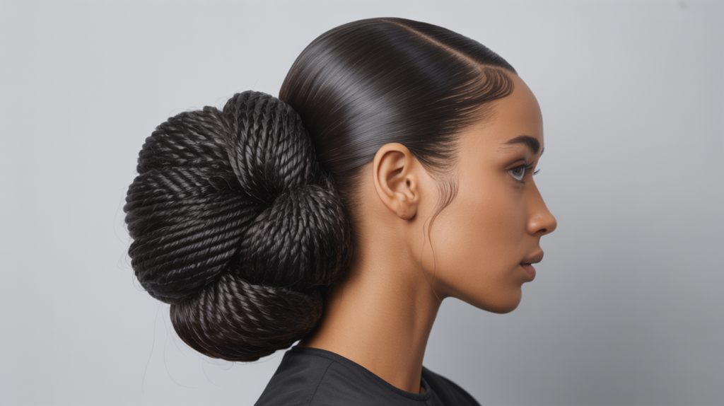 The style features a sleek, smoothed-back front that transitions into a large, voluminous bun made of intricate twisted sections. It’s an amazing choice for natural textures, keeping hair secure while looking incredibly elegant.