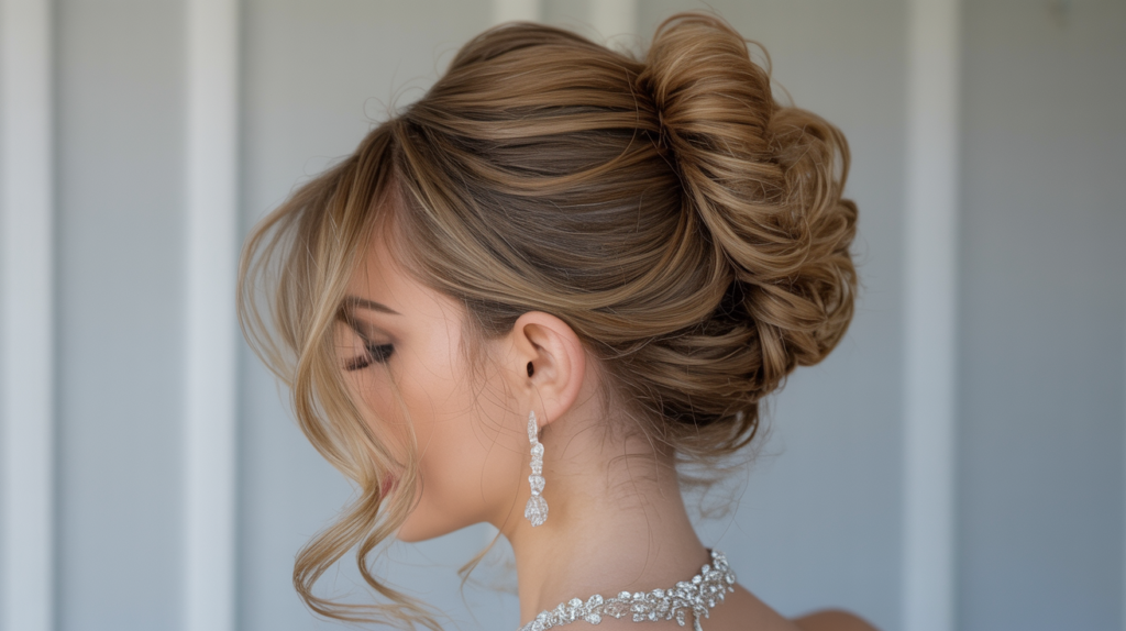 The hair is swept into a voluminous, looped bun with soft texture, avoiding that overly tight look. It’s a fantastic choice for prom to keep hair off your neck while still feeling romantic.