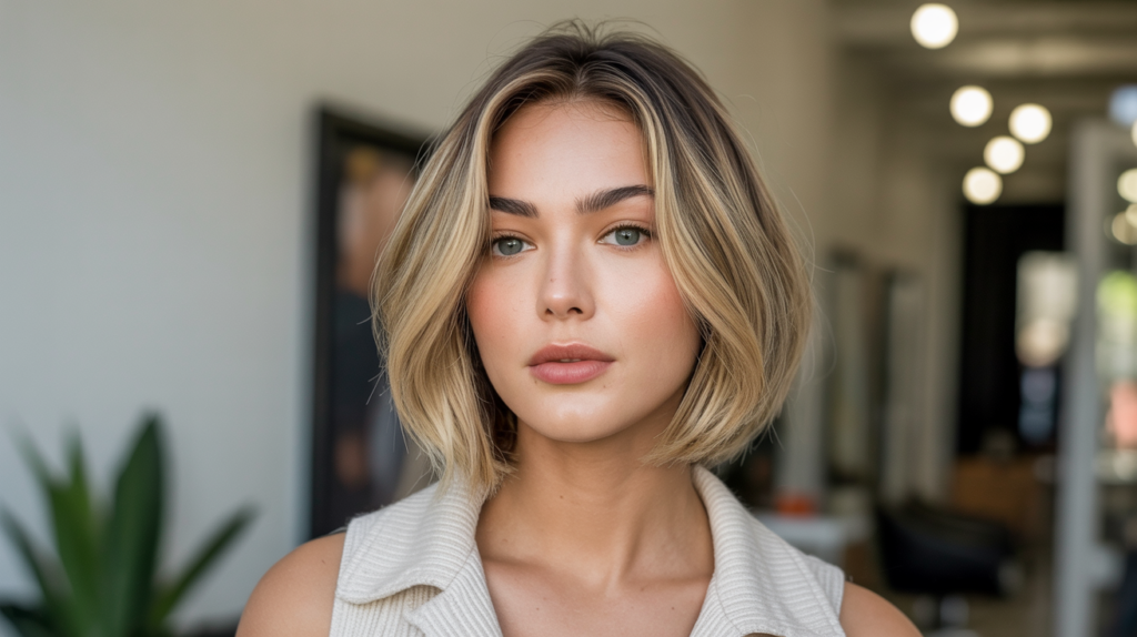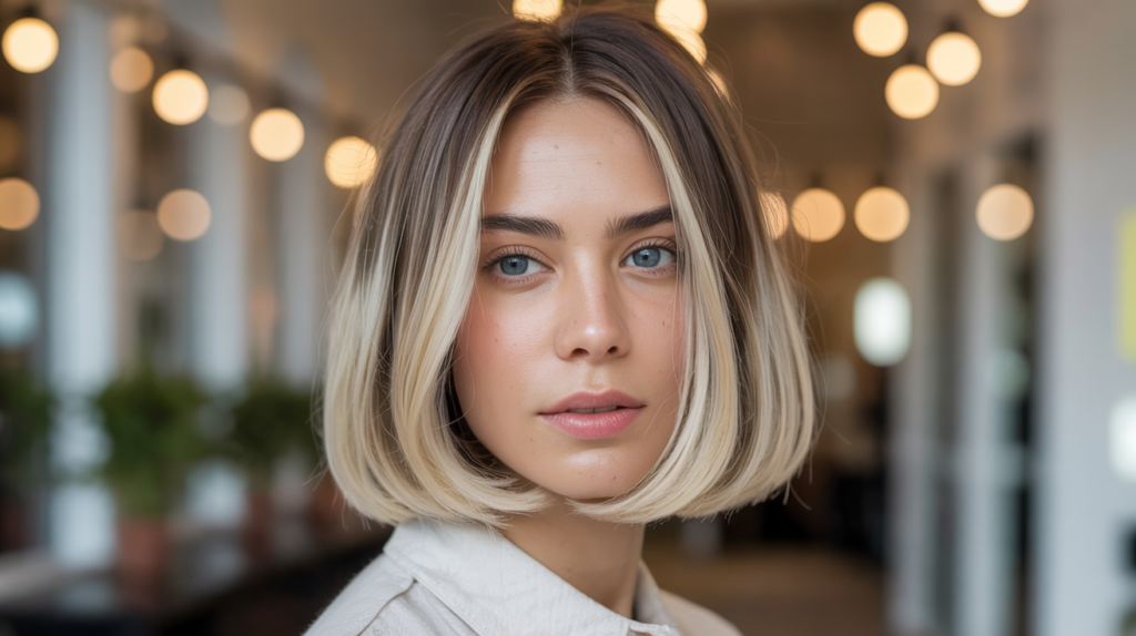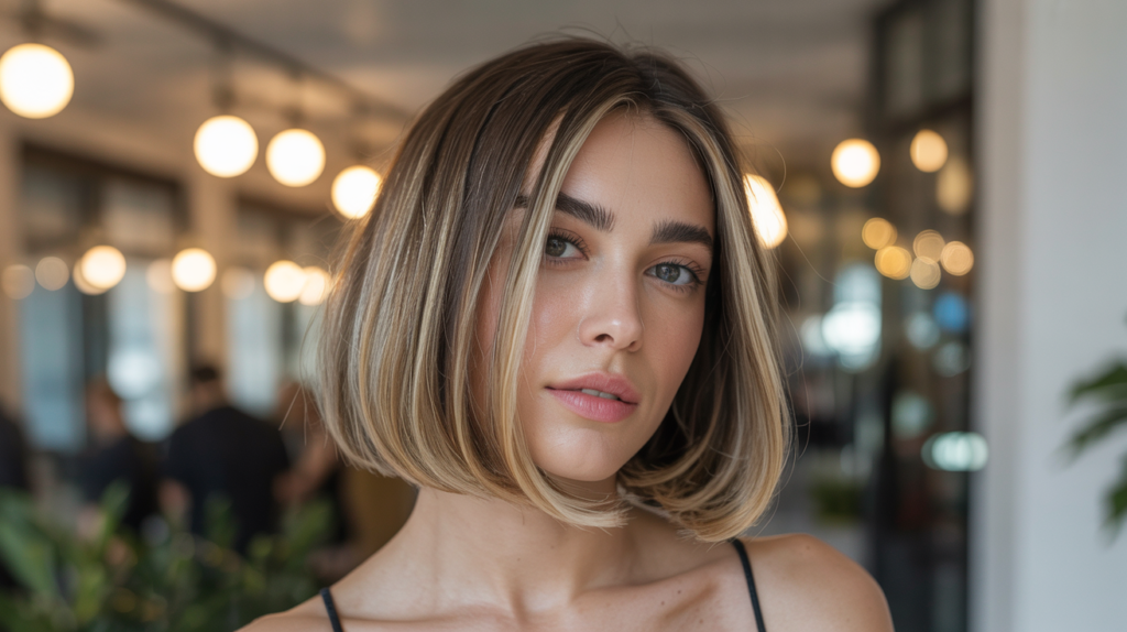 A refined shoulder-length blunt-bob-haircut featuring soft blonde highlights for a polished yet natural finish that complements both casual and formal looks effortlessly.
