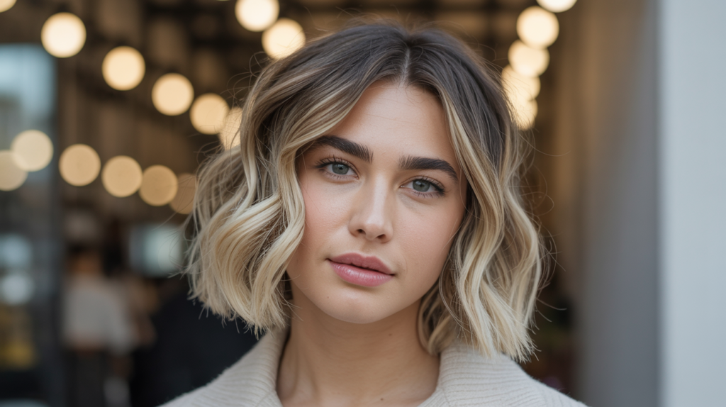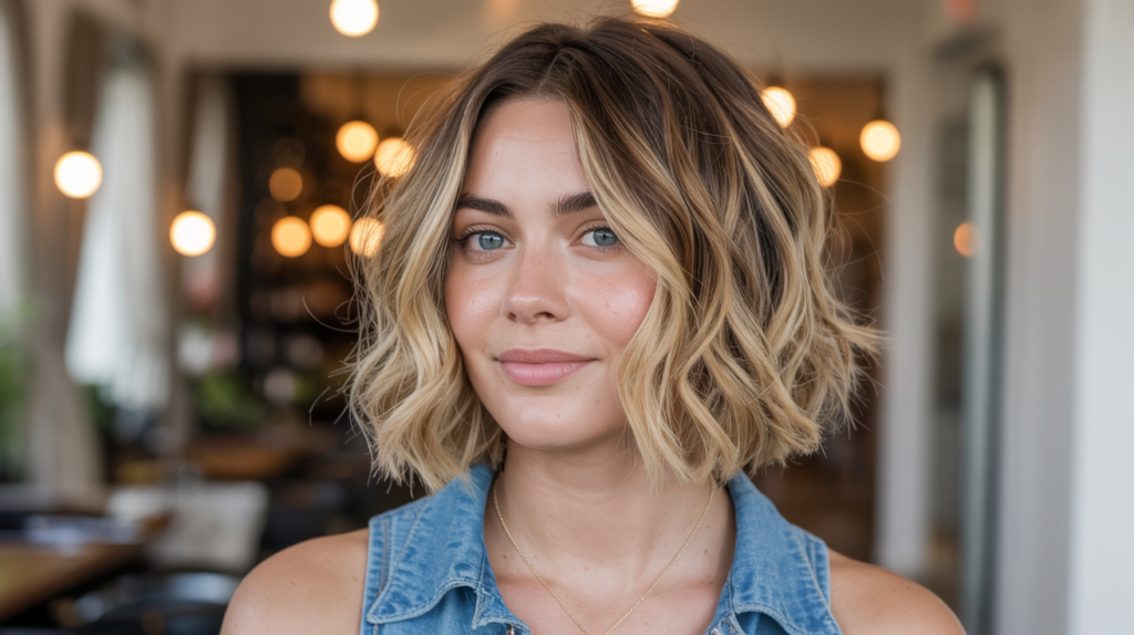 A relaxed and modern blunt-bob-haircut that blends tousled beach waves with soft balayage tones, creating a natural and carefree look ideal for effortless everyday wear.