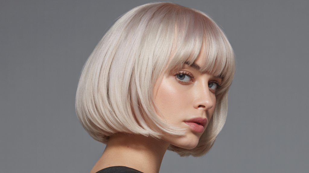 A sleek, softly shaped blunt-bob-haircut in radiant platinum blonde that brings out smooth texture and reflective shine, perfect for a modern, versatile everyday style.