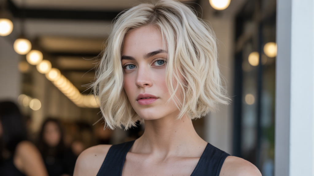 A modern wavy blunt-bob-haircut with cool-blonde tones that add dimension and brightness, ideal for women who love effortlessly chic, soft-textured styles