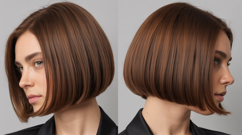 A sleek Warm Brunette Short Blunt Bob hairstyle shown from front, back, and side views. This modern bob highlights straight, polished ends with warm tones for a chic, versatile look.