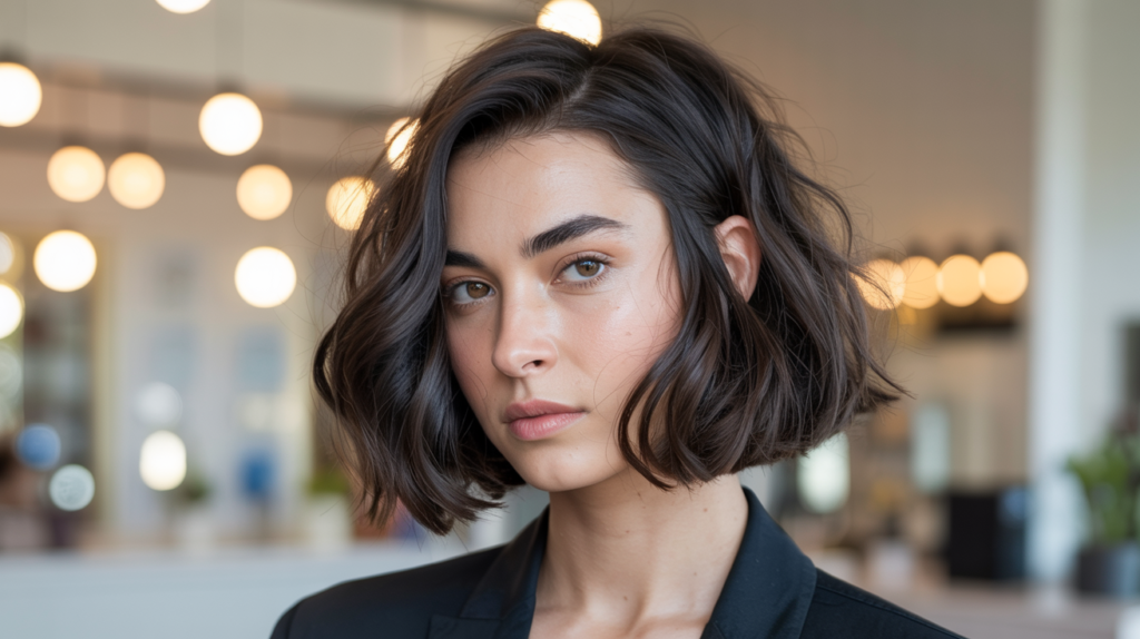 A refined yet effortlessly tousled blunt-bob-haircut with dark tones that offer volume, shape, and contemporary edge—perfect for those who love minimal-styling chic