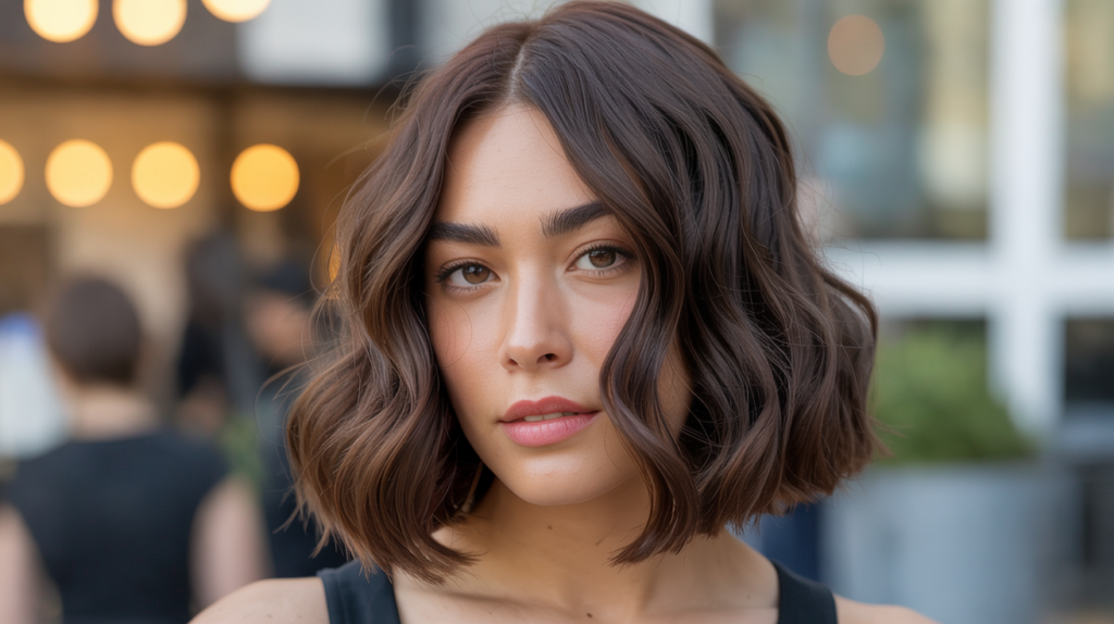 A warm chocolate brown tone meets the sleek confidence of a wavy blunt bob. This look brings out soft texture and glossy color, making it a perfect choice for women who love effortless sophistication.