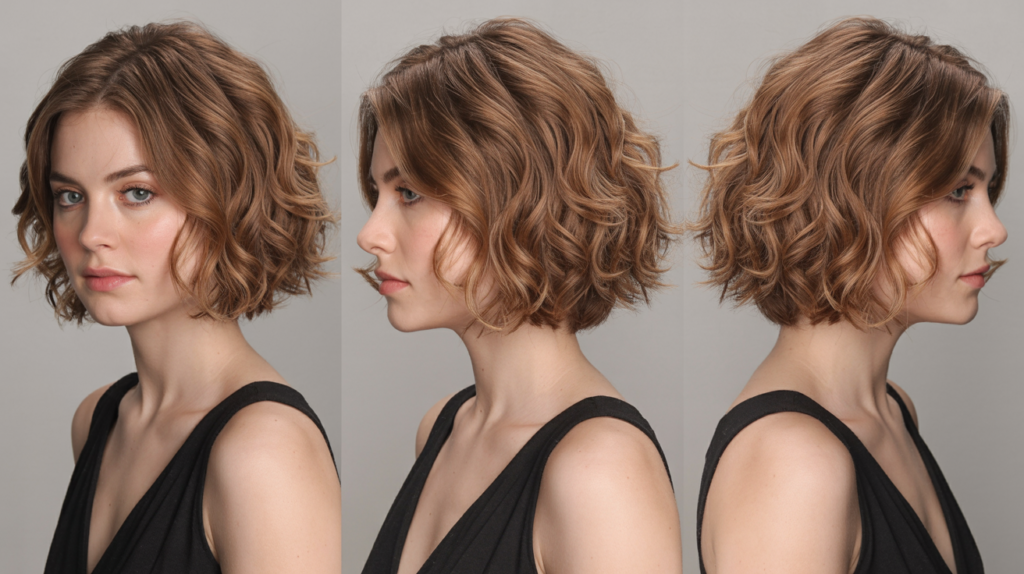 A chic Wavy Angled Blunt Bob hairstyle shown from front, back, and side views. This bob highlights soft waves, angled edges, and polished texture for a modern, versatile look.