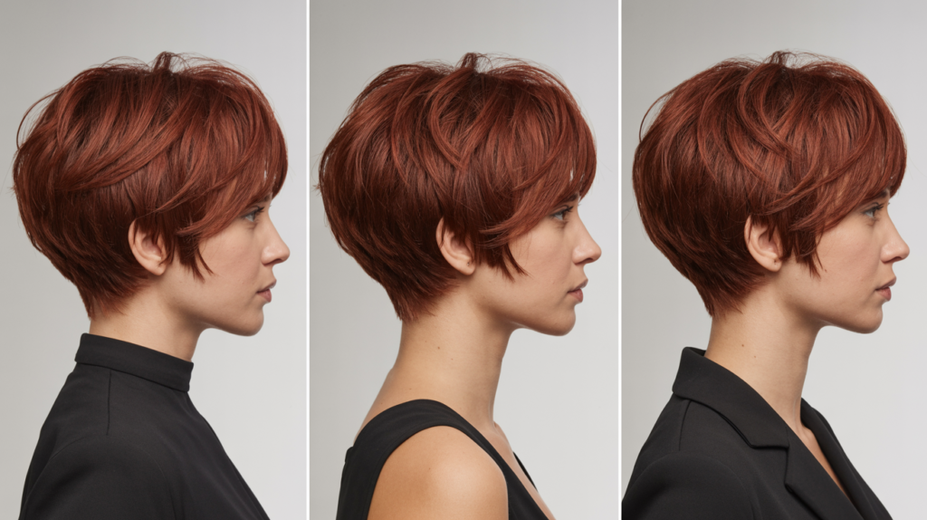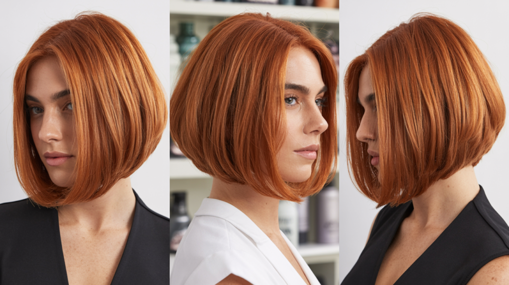 A stylish Warm Copper Blunt Bob with Soft Layers shown from front, back, and side views. This bob combines smooth edges, subtle layers, and warm copper tones for a polished, modern look.