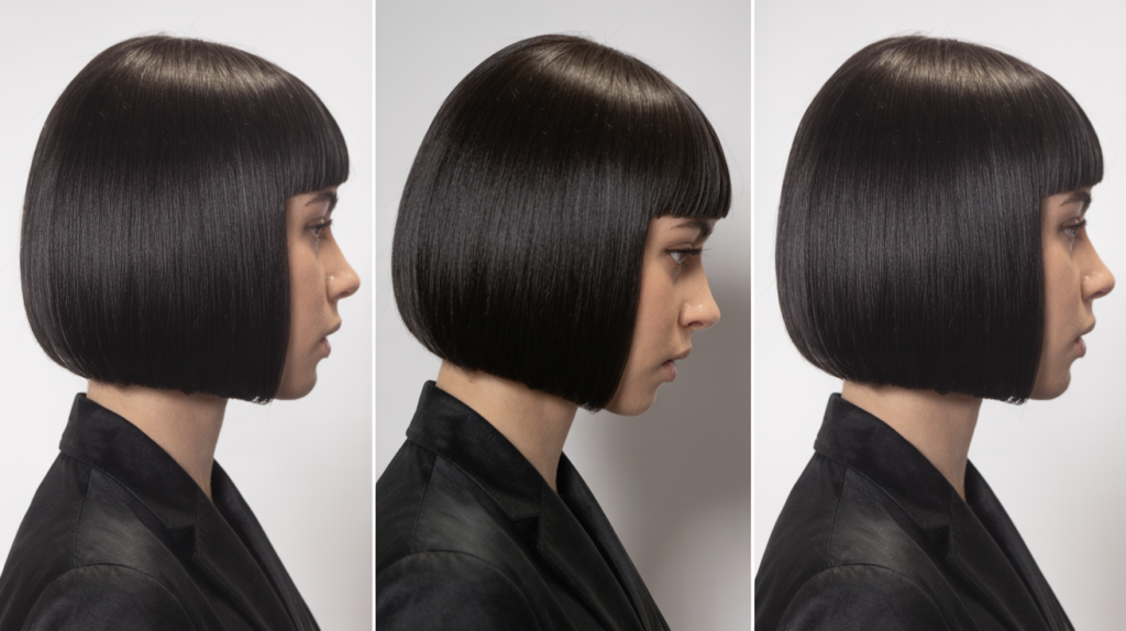 A sleek Short Chin-Length Blunt Bob hairstyle shown from front, back, and side views. This sharp, polished bob highlights smooth texture and a modern, versatile look.